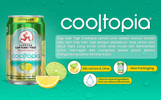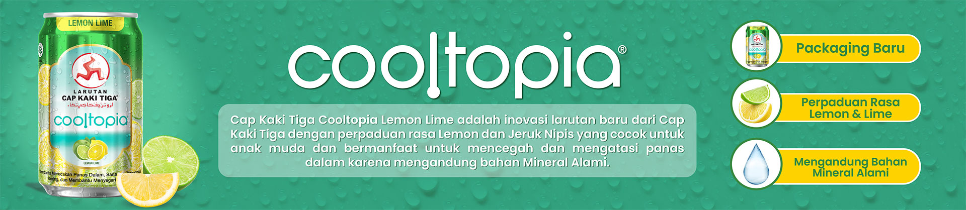 Cap Kaki Tiga Cooltopia Lemon Lime adalah inovasi larutan baru dari Cap Kaki Tiga dengan perpaduan rasa Lemon dan Jeruk Nipis yang cocok untuk anak muda dan bermanfaat untuk mencegah dan mengatasi panas dalam karena mengandung bahan Mineral Alami.